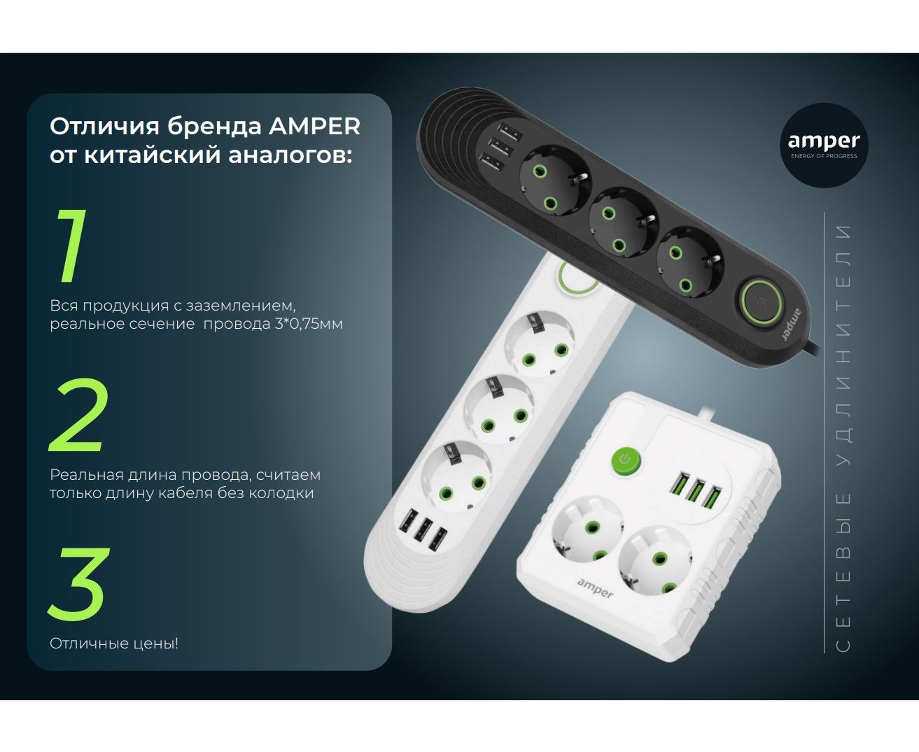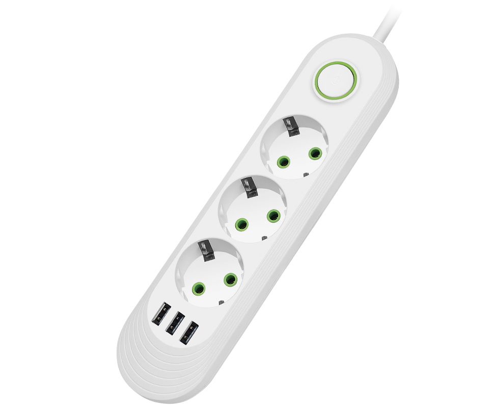 Сетевой удлинитель Amper , 2,0м, 3 розетки, 3*0,75мм, 10А, 2500 Вт, 3usb, белый