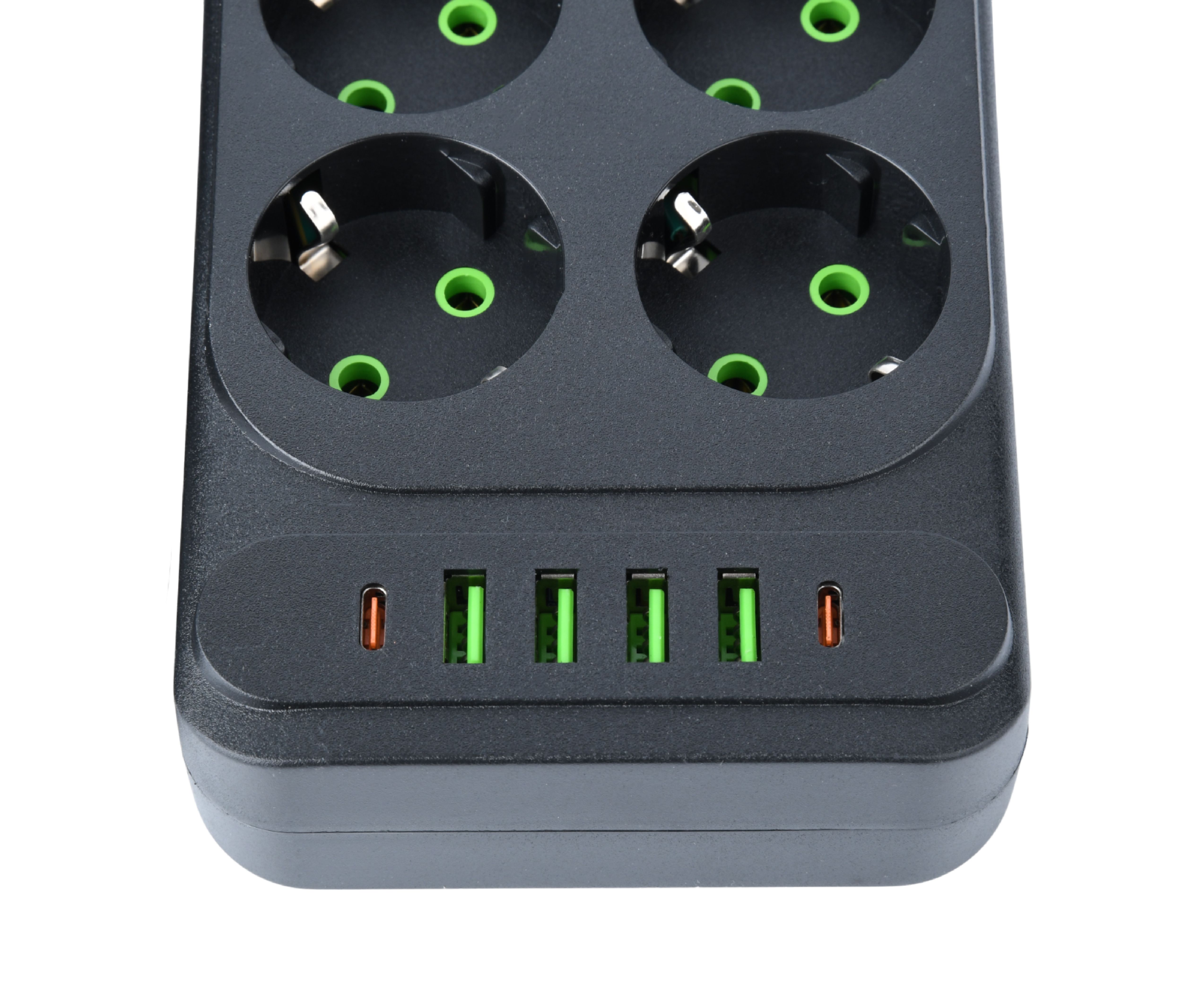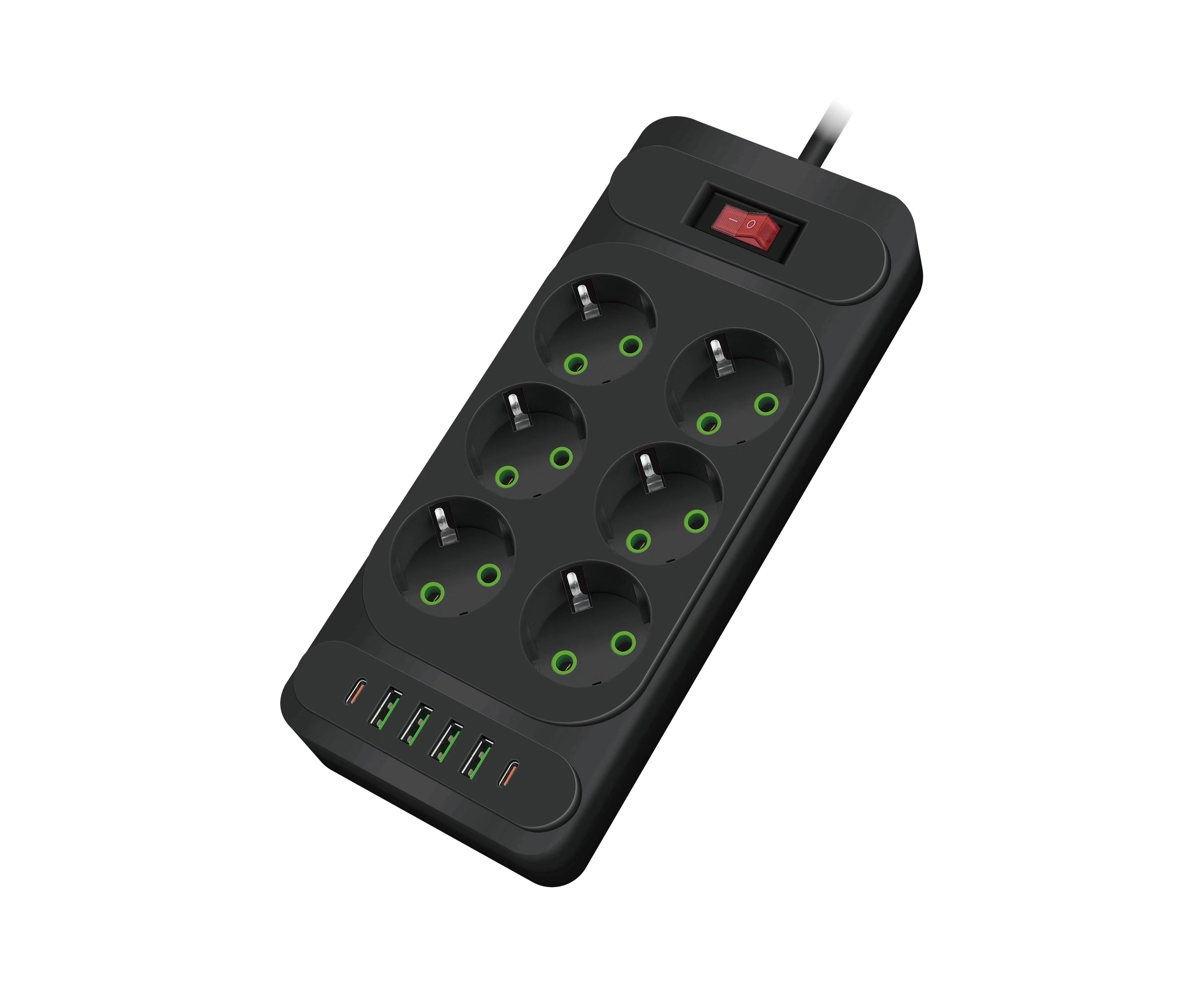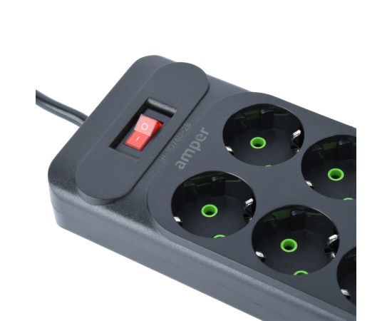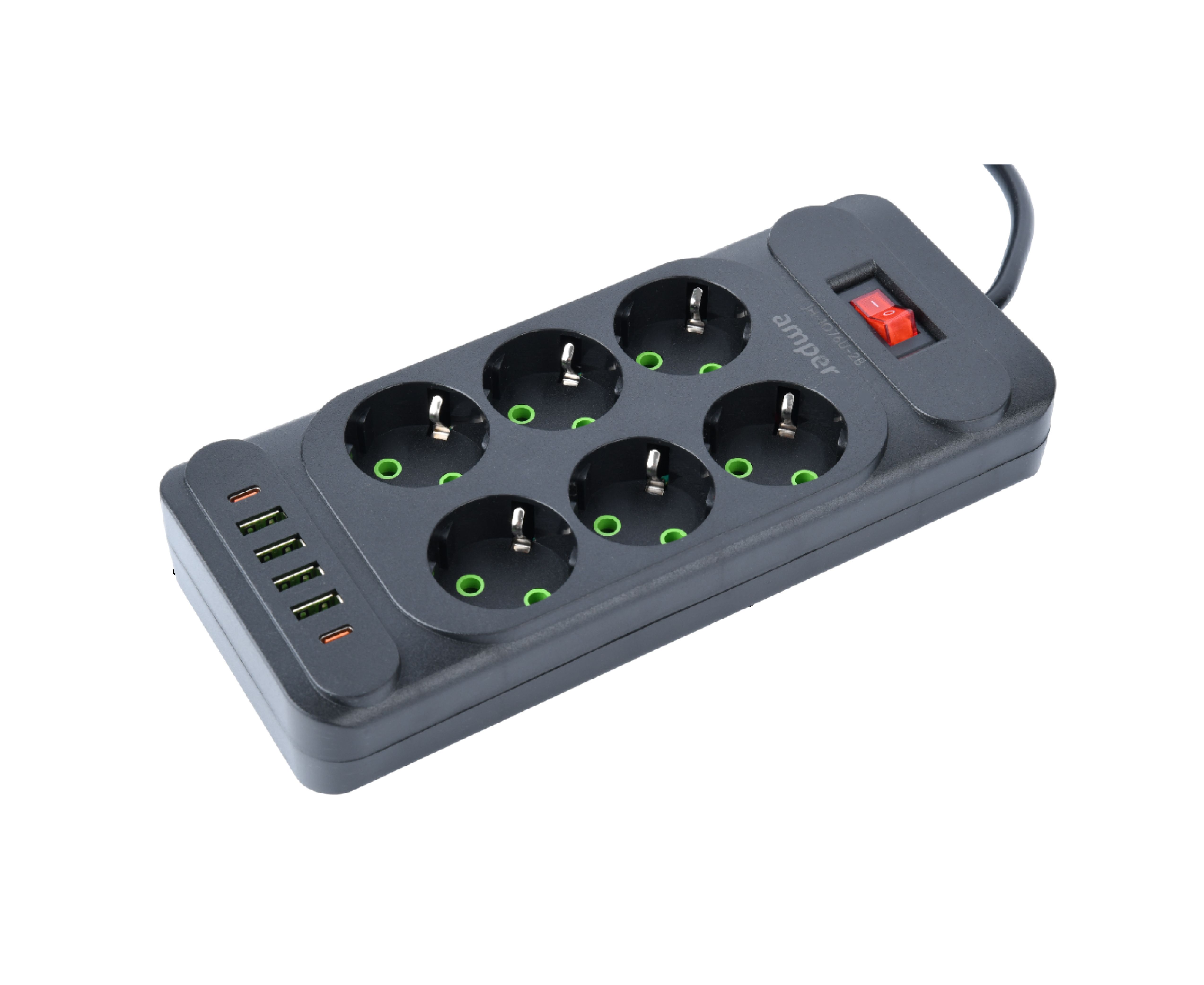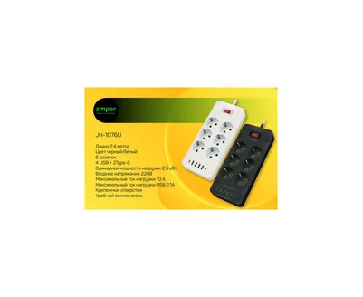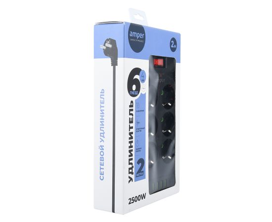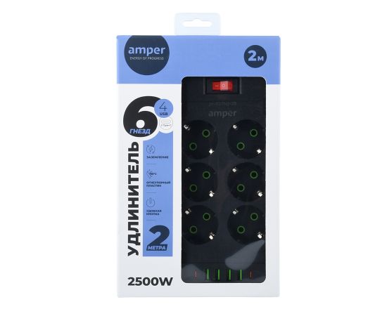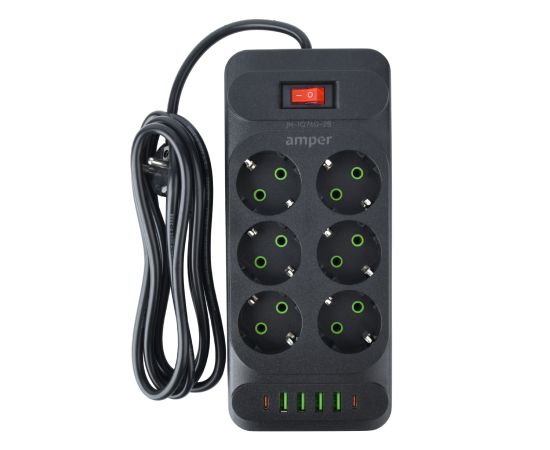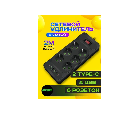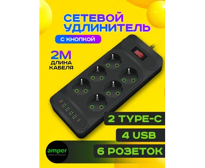 Сетевой удлинитель Amper 2,0м, 6 розеток, 10А, 2500 Вт, 4usb,2Type-C, черный