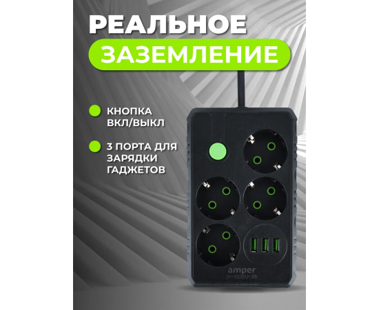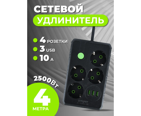 Сетевой удлинитель Amper , 4,0м, 4 розетки, 10А, 2500 Вт, 3usb, черный