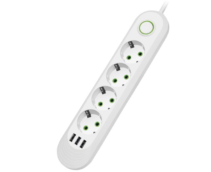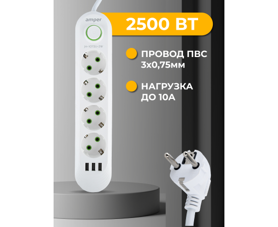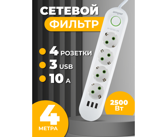 Сетевой удлинитель Amper , 4,0м, 4 розетки, 3*0,75мм, 10А, 2500 Вт, 3usb, белый