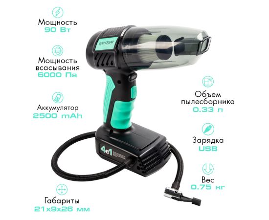 Время работы пылесоса: 20 мин, Время работы компрессора: 40 мин, Время зарядки: 2.5 ч, Скорость накачивания: 20 л/мин., 4 в1: аккумуляторный пылесос, светодиодный фонарик, компрессор, датчик измерения давления, 5 автоматических режимов компрессора: мяч, велосипедные шины, мотоциклетные шины, автомобильные шины, шины для пикапов, Переключаемая единица измерения: PSI, BAR, KPA, кг/см², Прорезиненная мягкая ручка, Высокоскоростной двигатель, Моющийся съемный контейнер для сбора пыли и воды