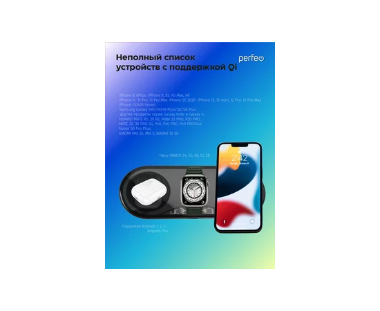 Беспроводное зарядное устройство для iphone и Android с поддержкой технологии беспроводной зарядки QI. Зарядное устройство 3 в 1 подходит для всех телефонов имеющих функцию беспроводной зарядки. Заряжает сразу 3 устройства одновременно. Удобная беспроводная станция на три устройства позволит избавится от проводов на столе и добавить комфорта. Встроенная подсветка, которую можно отключить сделает устройство еще более нарядным. Имея такую станция дома Вы забудете о поиске кабеля - просто положите телефон, часы или наушники на Вашу беспроводную зарядную станцию и зарядите их. Зарядное устройство имеет разъем питания type C. Мы рекомендуем использовать блок питания от 15 до 20 Ватт. Встроенная защита от замыкания обезопасит ваши устройства. Внимание! Не все телефоны имеют функцию беспроводной зарядки, поэтому прежде чем заказывать, просим Вас спросить у нашей тех. поддержки есть ли такая функция или на сайте производителя вашего телефона можно найти данную информацию. Мы приводим список популярных устройств с поддержкой QI на сегодня: Samsung GalaxyS10/S9/S9 Plus/S8/S8 Plus/Note 9/Note 8/Note 5/S6 Edge/S7/S7 edge и другие продукты серии Galaxy Note и Galaxy S. iPhone: 12/13 все серии, 11/11 pro/X/XS MAX/XR, iPhone8/8 plus