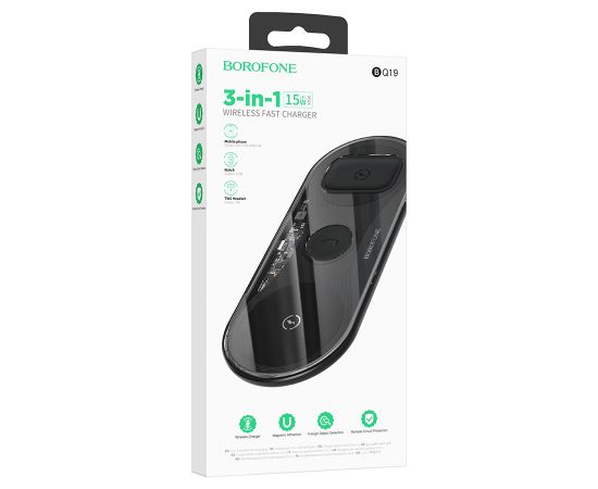Беспроводное зарядное устройство BOROFONE BQ19 Powerful 3-in-1 для iPhone+Airpods+Apple Watch, 3A, 5W/7.5W/10W/15W, черный