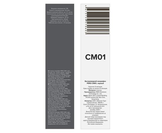 Беспроводной микрофон PERO CM01. Емкость аккумулятора: 50 мАч. Время в режиме работы: до 4 часов. Рабочее расстояние: ≤ 20 метров. Соотношение сигнал/шум: адаптивное шумоподавление 64 дБм. Цвет: черный.