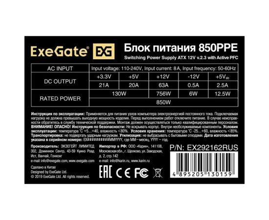 Блок питания ExeGate 850PPE EX292162RUS-PC 850W (ATX, APFC, PC, КПД 80 (80 Plus), 12cm fan, 24pin, 2x(4+4)pin, PCIe, 6xSATA, 3xIDE, black)