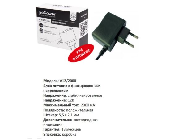 Блок питания GoPower 2.0A 12V 5,5x2,5/12мм для ресивера Триколор ТВ и НТВ+ (1/100)
