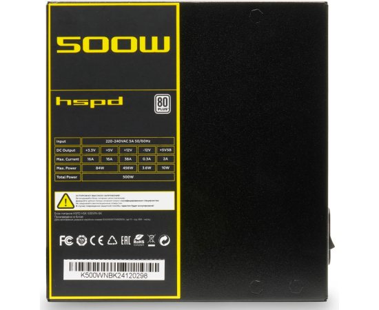 Блок питания HSPD HSK-500WN-BK 500W 80+ White (ATX, 2.52, Non-modular, 1x24(20+4)pin 500mm, 1xCPU 8(4+4)pin 550mm, 1xPCIe*2 8(6+2)pin 500+150mm