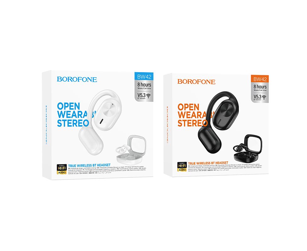 Беспроводные наушники Borofone BW42 TWS с креплением за ухом - современные наушники, которые обеспечат вам отличное качество звука и надежную фиксацию во время активных занятий и спортивных тренировок. Благодаря конструктивному решению крепления, их невозможно стряхнуть или потерять во время бега или тренировки. Наушники оснащены встроенным микрофоном, позволяющим совершать звонки и вести разговоры без необходимости снимать наушники. Они совместимы с ПК, ноутбуками, телефонами и планшетами, поддерживающими функцию Bluetooth 5.3. Емкость аккумулятора обеспечивает время работы в режиме активного использования в течение 8 часов, а в режиме ожидания до 180 часов. Они маленькие, легкие и удобные, что делает их идеальным выбором для длительной работы или развлечений. Выполнены в двух цветах.