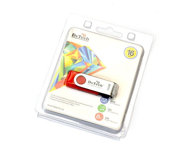 Корпус DeTech изготовлен из прочного пластика. Благодаря богатой цветовой гамме каждая модель приобретает индивидуальный характер. Дополнительным преимуществом является поворотная металлическая скоба, которая также защищает устройство памяти USB и придает ему неповторимый вид. Поворотная система замыкания USB и отсутствие колпачка удовлетворит потребности даже самых рассеянных пользователей.