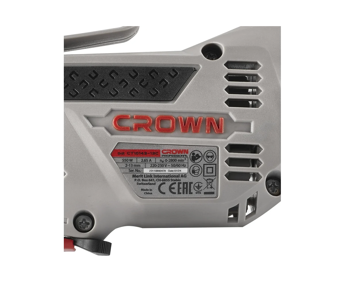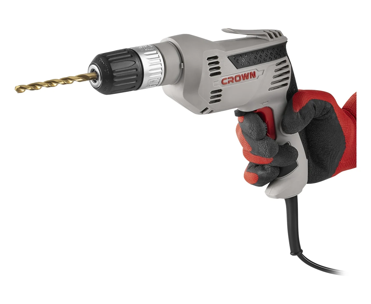 Для работ с разными материалами и с разнообразной оснасткой, дрель Crown CT10143-13C оснащена регулировкой частоты вращения с помощью встроенного в клавишу выключателя регулятора с 10-ю ступенями регулировки.
