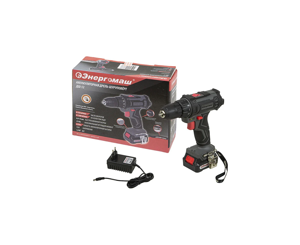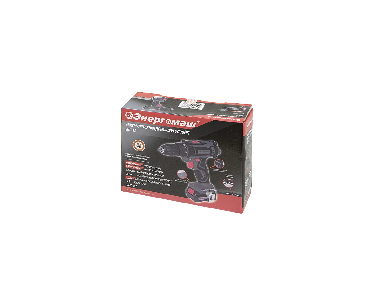 Дрель Энергомаш ДШ-12 12В, 25Нм, 1х2.0Ач, 0-350/0-1300об/мин, клипса, картон