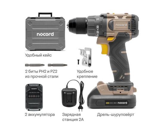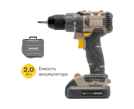 Дрель-шуруповерт Nocord 901068.NBD-20.2.20.A60-2 бесщеточная , 20В, 2x2 А·ч Li-Ion, 60 нм, в кейсе