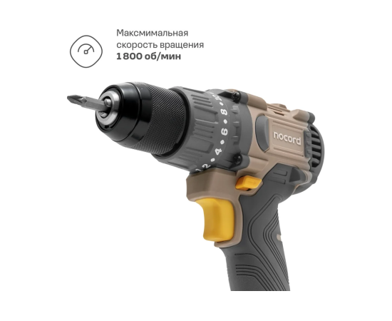 Аккумуляторный шуруповёрт Nocord работает на двух скоростях: первая — для закручивания крепежа с использованием муфты-ограничителя, вторая — для сверления.