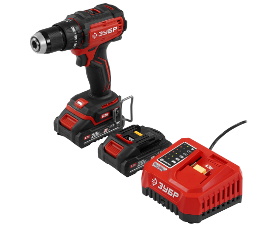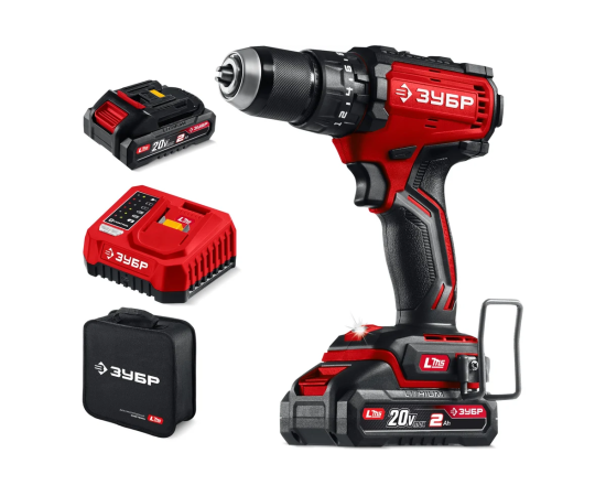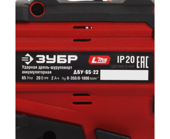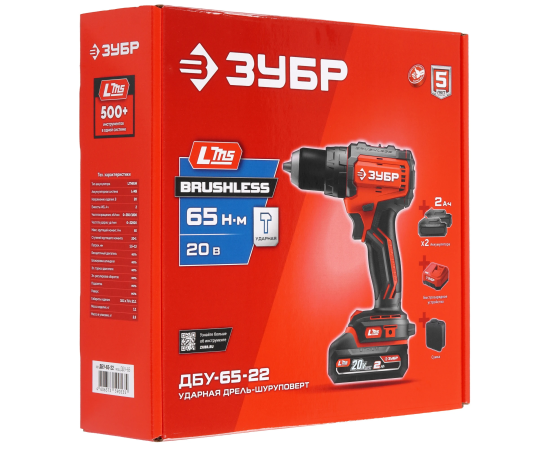 ЗУБР 20 В, 65 Н·м, 2 АКБ LMS (2 А·ч), бесщеточная ударная дрель-шуруповерт, сумка ДБУ-65-22 - бесщеточная дрель-шуруповерт ЗУБР системы LMS с увеличенным крутящим моментом предназначена для быстрого заворачивания саморезов до 8 мм диаметром и сверления отверстий до 30 мм в дереве. Длительная работа от одного заряда обеспечивается эффективным двигателем BRUSHLESS. Расширенная функциональность за счет ударного режима работы. Комплектация с двумя аккумуляторами позволяет работать практически без остановки.
