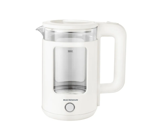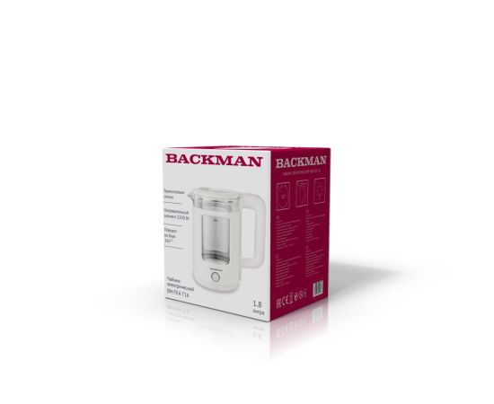 Электрочайник BACKMAN BM-TEA 716 1,8л, Электрочайник, 2200 Вт, 1,8 литра, корпус из высококачественного термостойкого стекла и пластика, закрытый нагревательный элемент, вращение подставки на 360°, световой индикатор работы, шкала уровня воды, автоматическое отключение при закипании, автоматическое отключение без воды.