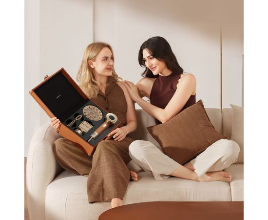 В комплект входят 5 магнитных насадок. Насадка для ароматической капсулы питает волосы, а насадка-концентратор создает стильную укладку. Насадка для разглаживания волос уменьшает пушистость волос, насадка-диффузор создает идеальные локоны, а насадка для гладкости выпрямляет ваши волосы, придавая им блеск.