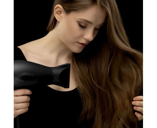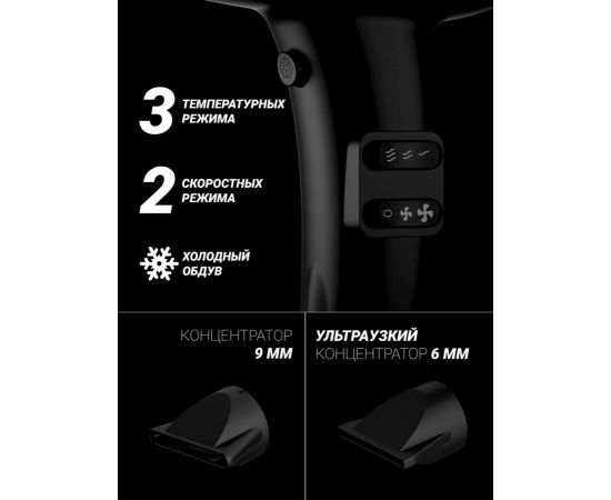 количество скоростей: 2; режимов: 3; насадок: 2шт; ионизация, концентратор; Мягкое, нескользящее покрытие корпуса Soft Touch; длина шнура: 3м; мощность: 2000Вт; цвет: черный