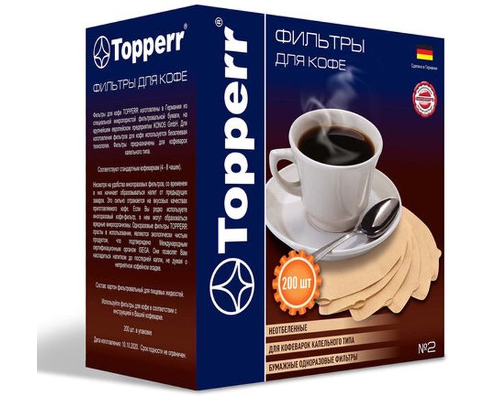 Бумажные одноразовые фильтры для кофе TOPPERR №2 (200 шт.) НЕОТБЕЛЕННЫЕ. Фильтры для кофе TOPPERR® изготовлены из специальной фильтровальной бумаги, произведенной в Германии, крупнейшей фабрикой Европы KONOS GmbH. Фильтры предназначены для маленьких кофеварок капельного типа.