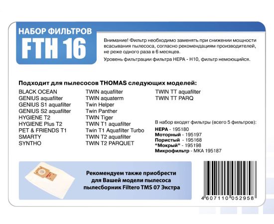 Фильтр HEPA для пылесосов Thomas Filtero FTH 16 Twin Aquafilter, Twin TT Aquafilter, Genius Aquafilter, Syntho (НЕРА, губчатые, микрофильтр)