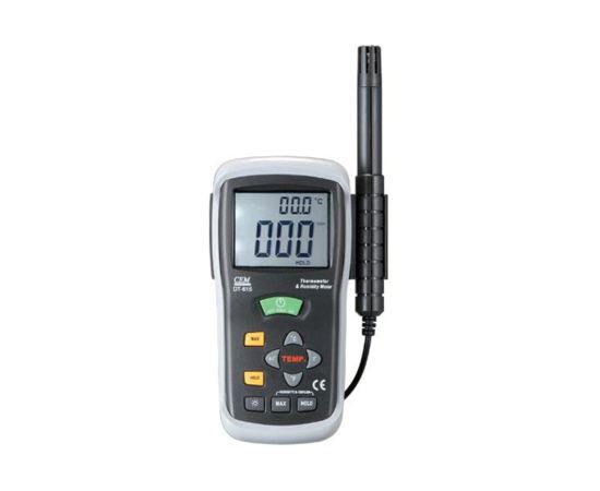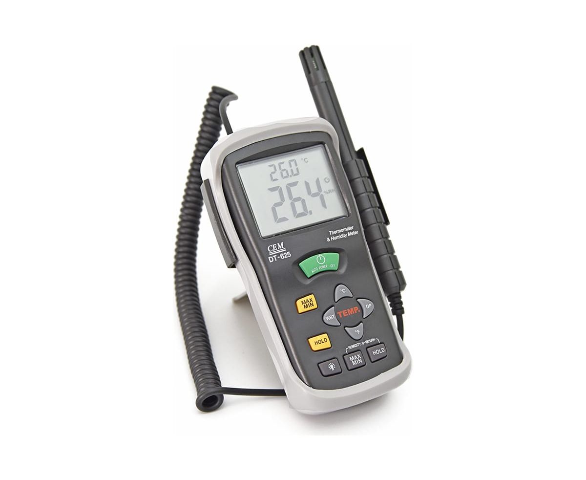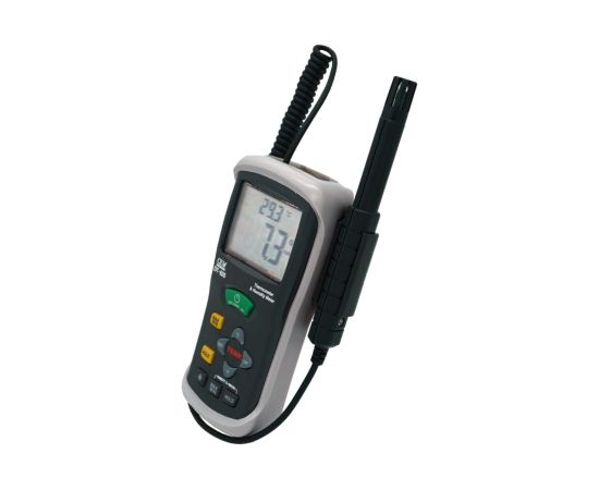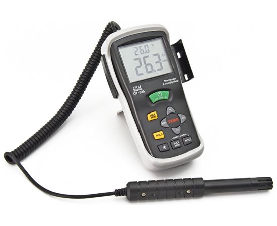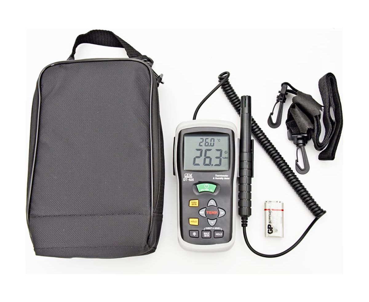 Гигрометр-термометр СЕМ DT-625 481882 оснащается двойным дисплеем для одновременного отображения температуры и влажности. Дополнительной возможностью модели является определение точки росы. Питание устройства осуществляется от современной батарейки типа Крона с напряжением 9В. Прибор весит всего 0.21 кг и имеет габариты 150х72х35 мм. Погрешность измерения влажности составляет 2%, температуры - 0.5 градуса.