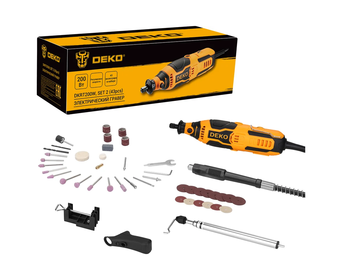 Электрический гравер DEKO DKRT200W с набором из 43 аксессуаров — это универсальный инструмент для бытового использования, который идеально подходит для выполнения широкого спектра задач.