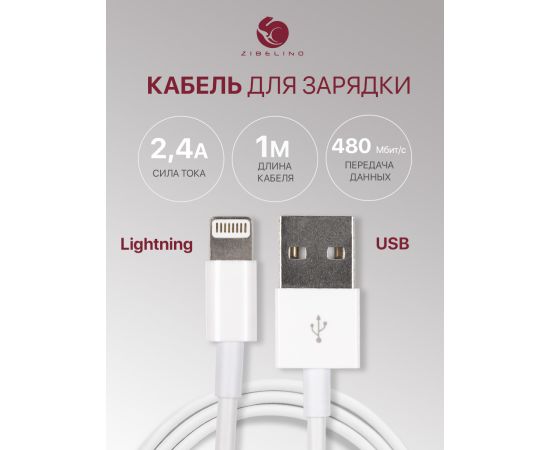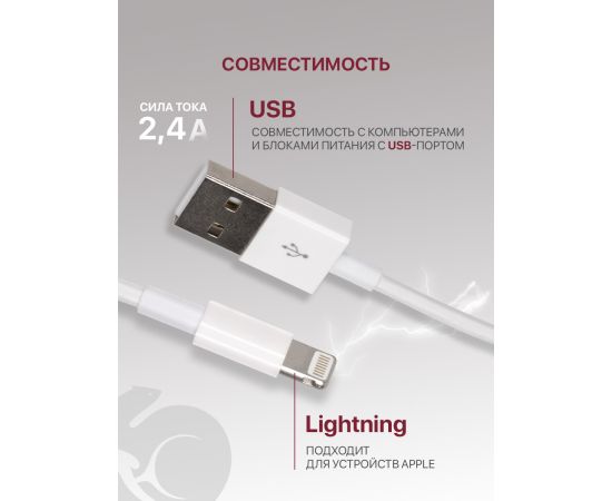 Кабель (AP) USB - Lightning (сила тока 2,4А, длина 1м) для зарядки iPhone, iPad, AirPods, iPod touch для телефона, планшета, наушников, смартфона, белый (ЮЗБ-Лайтинг)