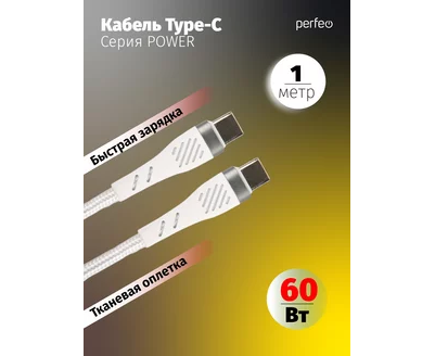 Кабель PERFEO USB C вилка - C вилка, 60W, белый, длина 1 м., POWER (C1104)