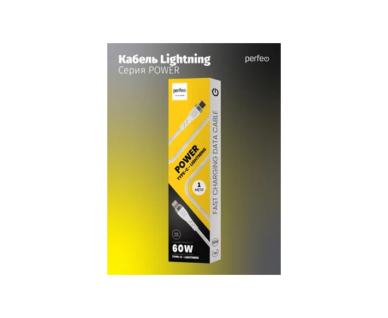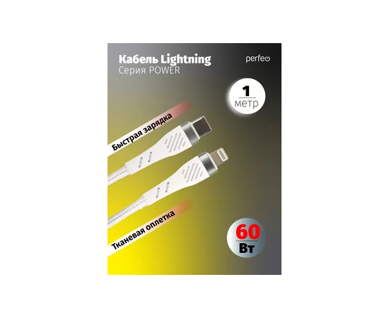 Кабель PERFEO USB C вилка - Lightning вилка, 60W, белый, длина 1 м., POWER (C1004)