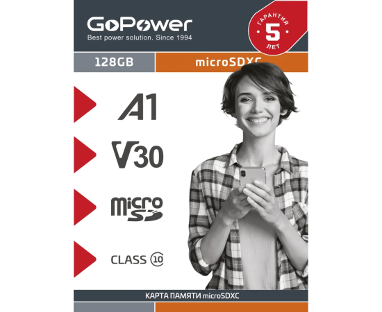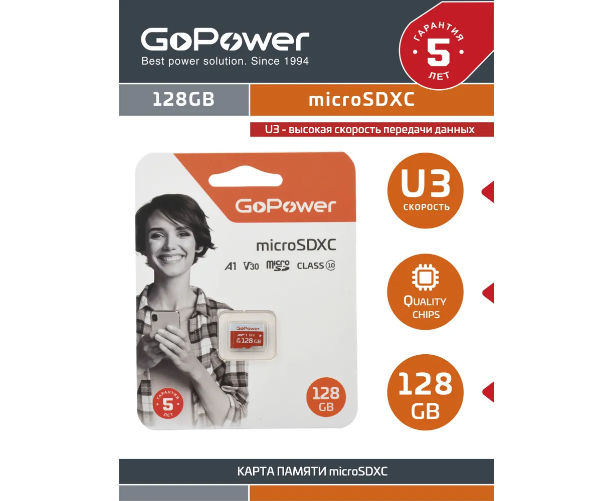 Карта памяти microSD GoPower 128GB Class10 UHS-I (U3) 100 МБ/сек V30 без адаптера