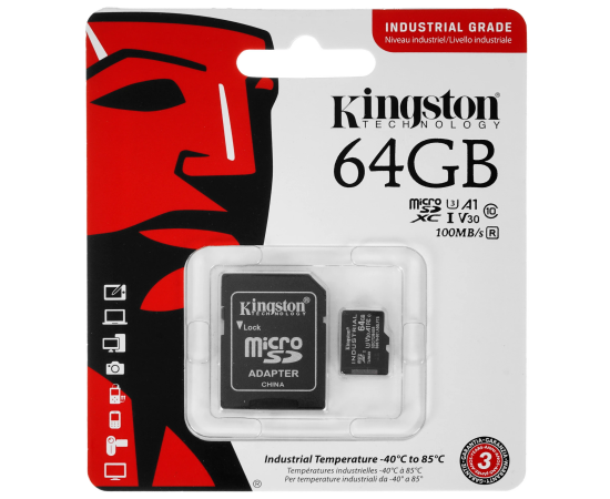 Карта памяти Kingston SDCIT2/64GB microSDXC 64Гб Class 10 UHS-I U3 V30 A1 TLC в режиме pSLC, темп. режим от -40℃ до +85℃, с адаптером