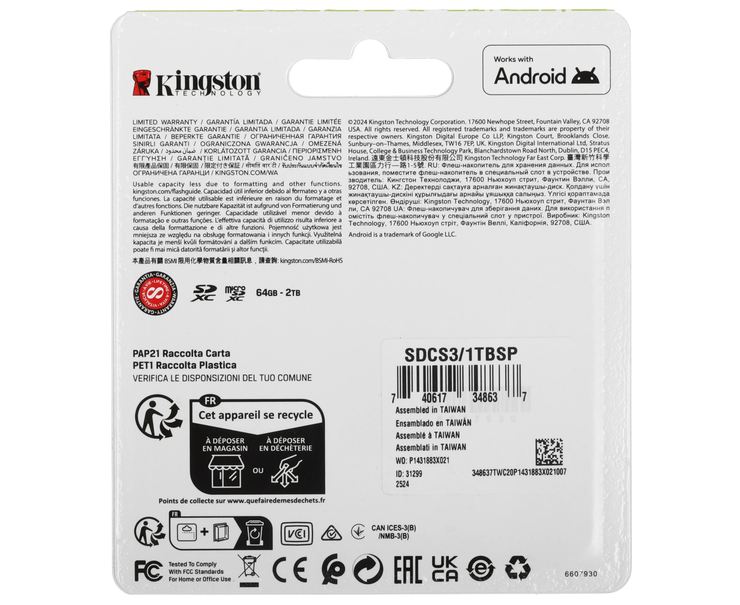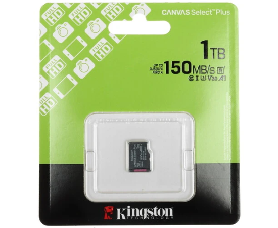 Карта памяти Kingston microSDXC 1000 ГБ [SDCS3/1TBSP] соответствует классам скорости A1, UHS Class 3 и Video Class 30. Изделие предназначено для смартфонов, фотокамер и других устройств.