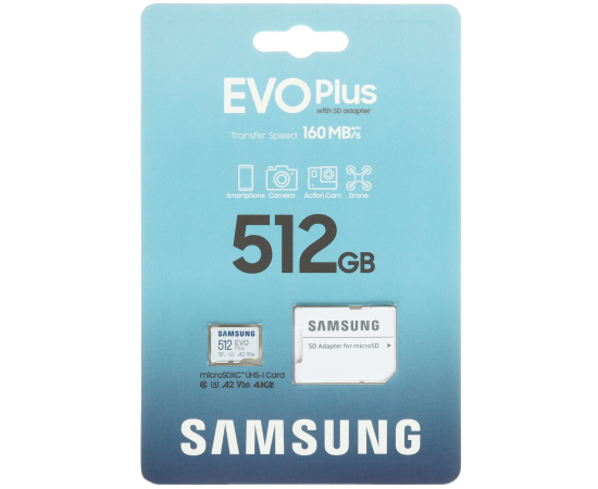 Карта памяти Samsung EVO Plus microSDXC 512 ГБ [MB-MC512SA/KR] типа microSDXC позволяет записывать и хранить данные общим объемом 512 ГБ. Классы A2, UHS Class 3 и Video Class 30 обеспечивают чтение с максимальной скоростью 160 Мбайт/сек.