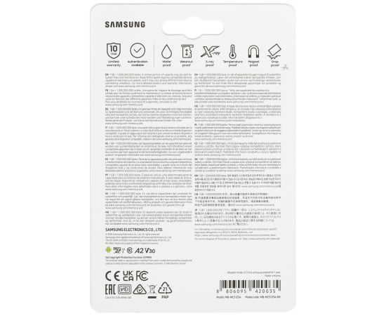 Карта Samsung EVO Plus microSDXC 512 ГБ [MB-MC512SA/KR] гарантирует исправность при соблюдении рабочей температуры в диапазоне от -25 до 85 °C с напряжением 5 В. Она подходит для использования в цифровых камерах для создания детализированных фотографий и видео, а также для установки в дроны и видеорегистраторы. Дополнительно устройство имеет адаптер SD и повышенную степень защиты от внешнего воздействия.