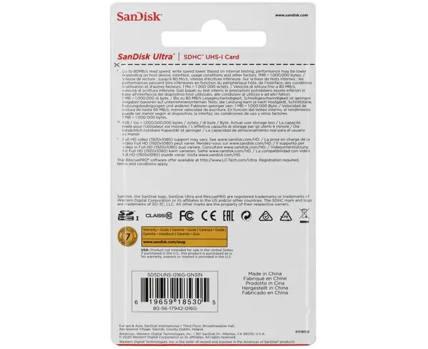 Карта памяти SanDisk Ultra SDSDUNS-016G-GN3IN 16GB SDHC Class 10 UHS-I 80MB/s