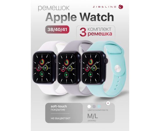 Комплект 3шт ремешок силиконовый для Apple Watch 38mm, 40mm, 41mm (размер M/L) белый + тиффани + серый (Эпл Вотч 38 мм 40 мм 41мм)