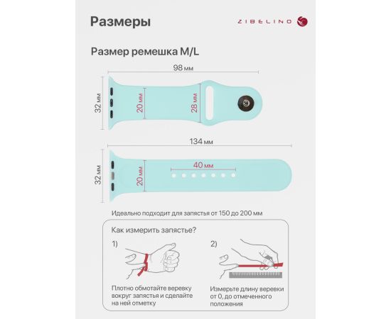 Ремешок размера M/L подходит для запястья обхватом от 15 до 20 см. Размер ремешка 232x20x2мм.