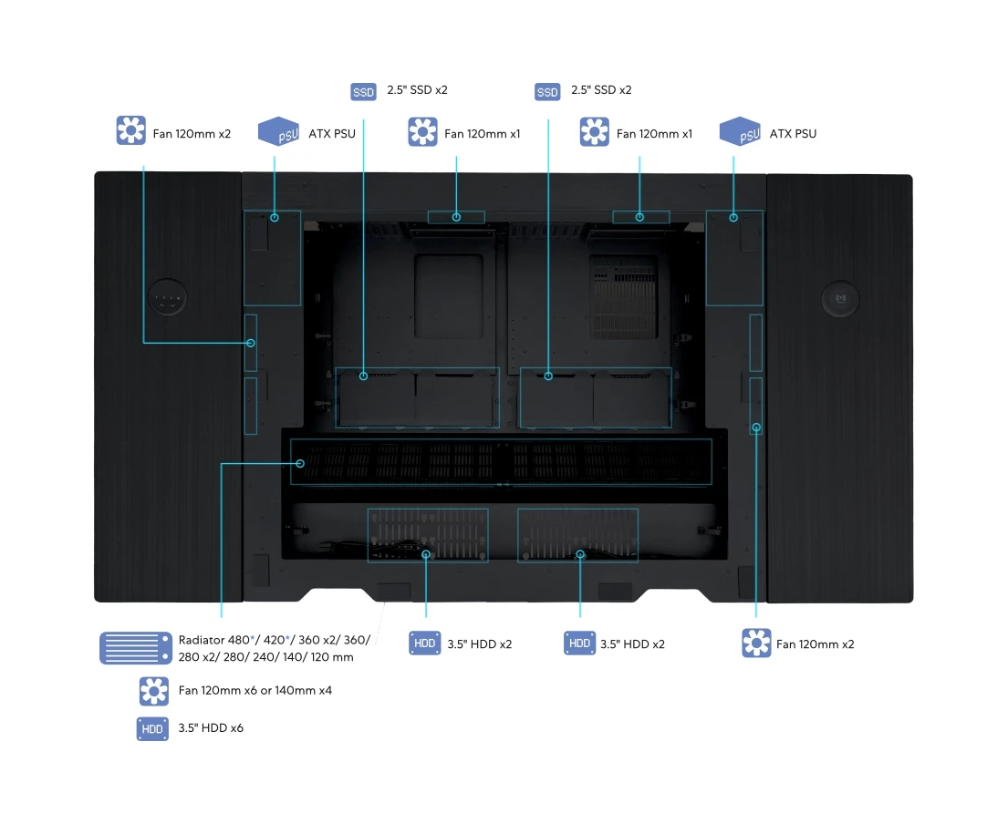 есть возможность сборки двух систем с дополнительным набором интерфейсов на лицевой панели, количество внутренних отсеков 2.5" в данной конфигурации уменьшается до 4