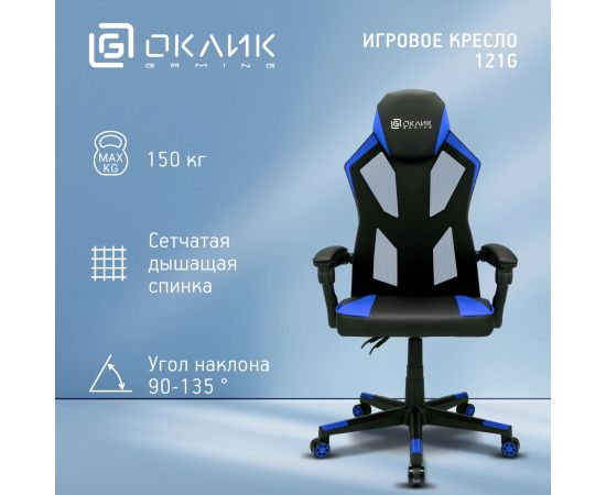 Кресло игровое OKLICK 121G 1987637 черный/синий сиденье черный/синий искусст.кожа/сетка с подголов. крестов. пластик черный