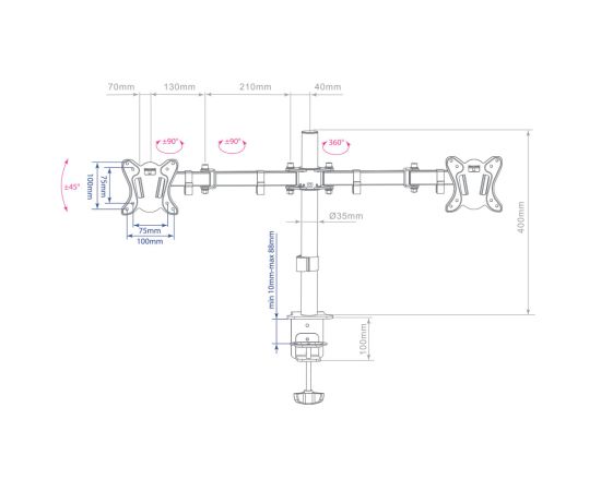 Особенности: Максимальная нагрузка: 2×8 кг. Регулируемое по высоте крепление. Мощная стальная конструкция. Съемная монтажная пластина. Надёжное крепление к столу