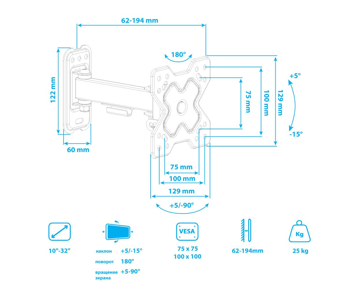 10"-32" Кронштейн Arm media MARS-5 black, max 25 кг, max VESA 100x100 мм