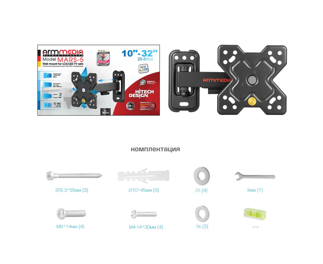 Кронштейн для телевизора, комплект ключей и крепежа для установки ТВ, навесной уровень, подробная инструкция на русском языке