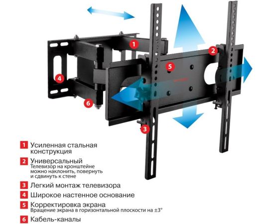 Особенности: Надежная стальная конструкция. Втроенный водяной уровень. Универсальная система крепления. Вращение экрана относительно стены ±5 . Защита от падения.