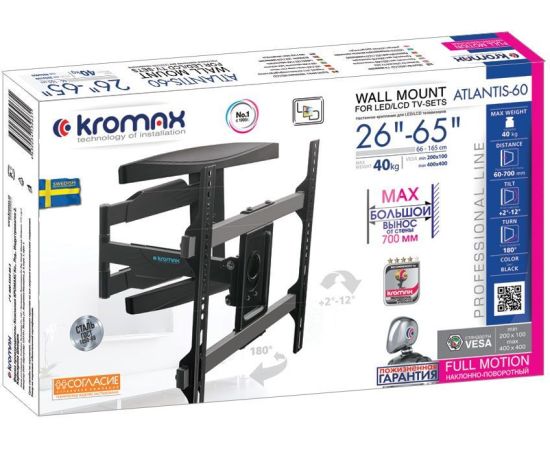 Кронштейн для телевизора Kromax ATLANTIS-60 черный 26"-65" до40кг поворотно-выдвижной и наклонный