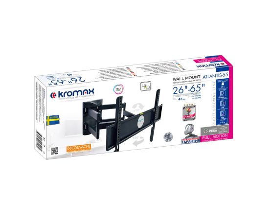 26"-55" Кронштейн Kromax ATLANTIS-55 black Наклонно-поворотный max 45 кг. 4 ст св., нак. ±10°, пов. 160°, от ст. 70-480 мм., max VESA 600x400 мм.