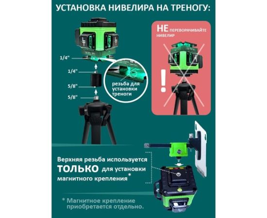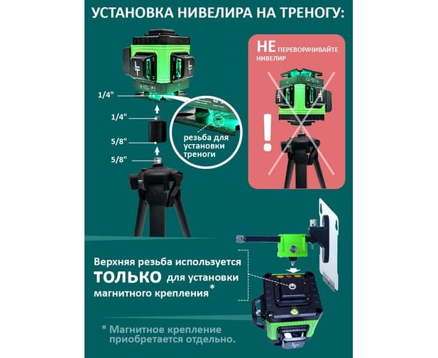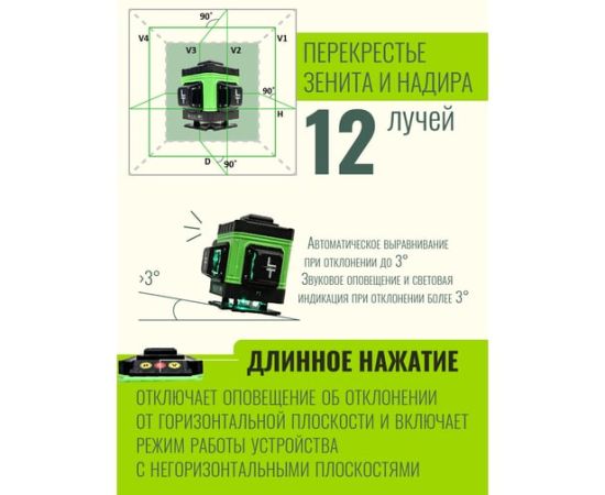 Уровень выстраивает 3 плоскости в 360 градусов (в круговую): - 2 вертикальные плоскости 360 градусов с пересечением под прямым углом 90 градусов-.1 горизонтальная линии 360 градусов снизу уровня. Нижний горизонт идеально подходит для работ по заливки полов и стяжки. Работает от Аккумулятор литий-ионный Li-Ion 6000 Мач (в комплекте идёт две батареи) с зарядным устройством. Зарядное устройство USB. Устройство можно заряжать во время эксплуатации как от блока питания, так и от power bank.