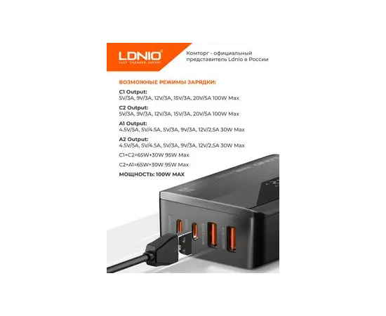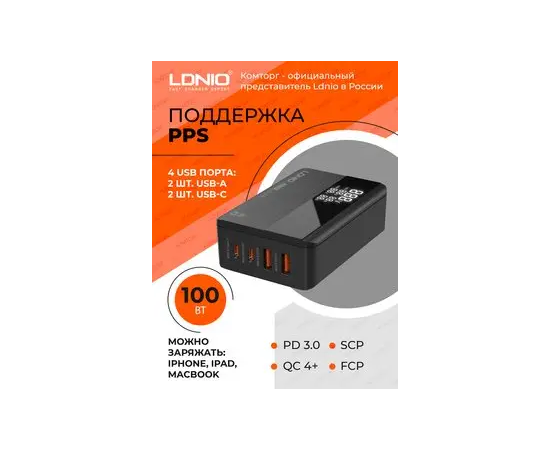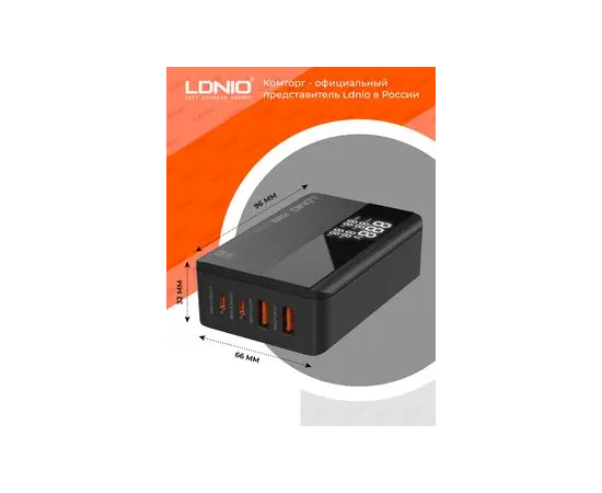 Сетевое зарядное устройство GaN LDNIO A4809C/ + LED дисплей/ PD+PPS+SCP+QC 4+/ 4 USB/ Выход: 3.3-20V, max 100W/ Черный