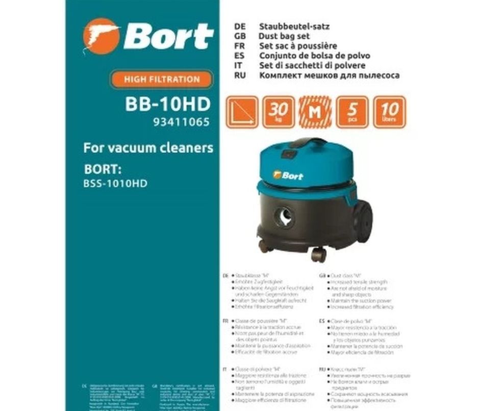 Пылесборник Bort BB-10HD представляет собой прочный мешок, в который собирается пыль и бытовой мусор во время уборки помещений. Совместим с пылесосами Bort BSS-1010HD. Способен выдерживать большие нагрузки. Во время эксплуатации не деформируется. Пылесборник с классом фильтрации "М" выполнен из прочной многослойной синтетической ткани повышенной плотности и дополнен креплением из картона. Он очень прост в установке, легко демонтируется. Подходит для сбора не только бытовой пыли, но и влажного, а также строительного мусора (крошки цемента, металлической стружки, щепок).