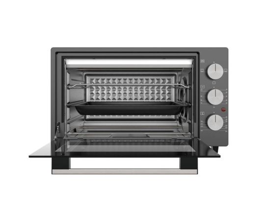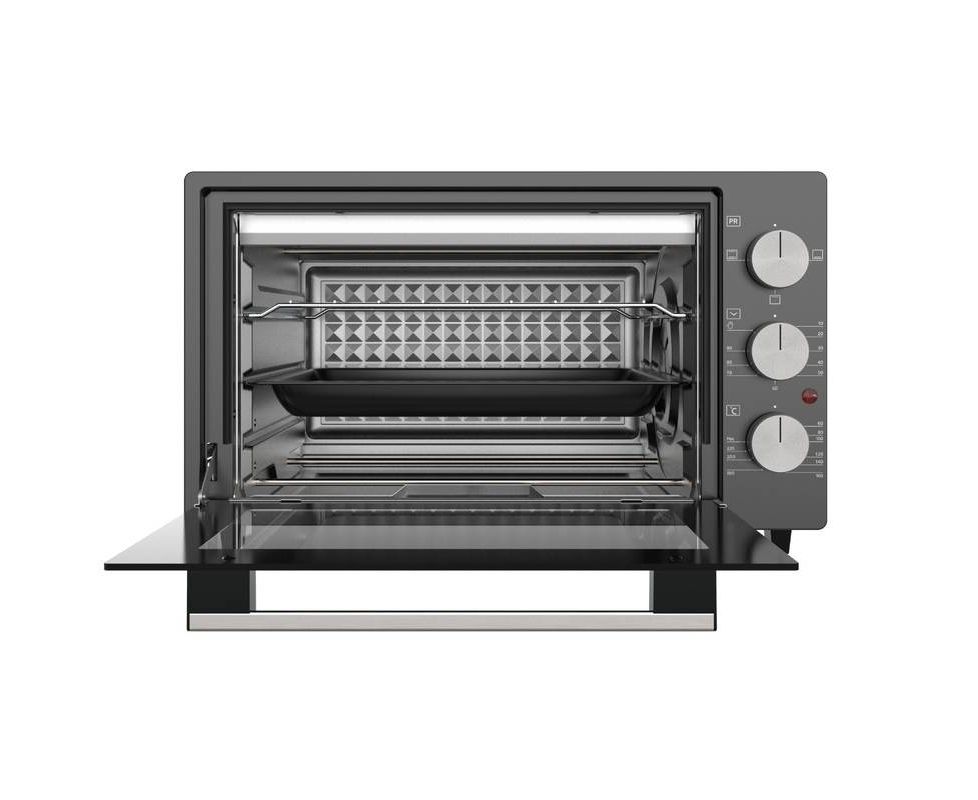 Комплектация мини печь; 1 стандартный эмалированный квадратный противень; 1 решетка; 1 эмалированный круглый противень; документация
