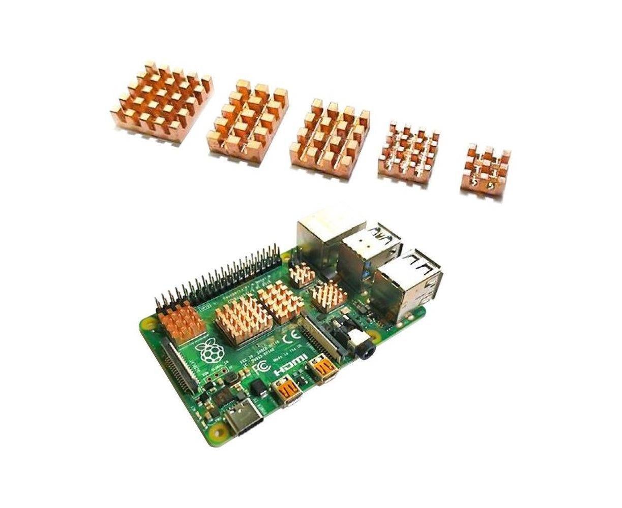 Комплект из пяти медных радиаторов для охлаждения микросхем одноплатного микрокомпьютера. 17x5х5мм, 14x10x5мм, 12x13x5мм, 5x5х5мм 2 шт