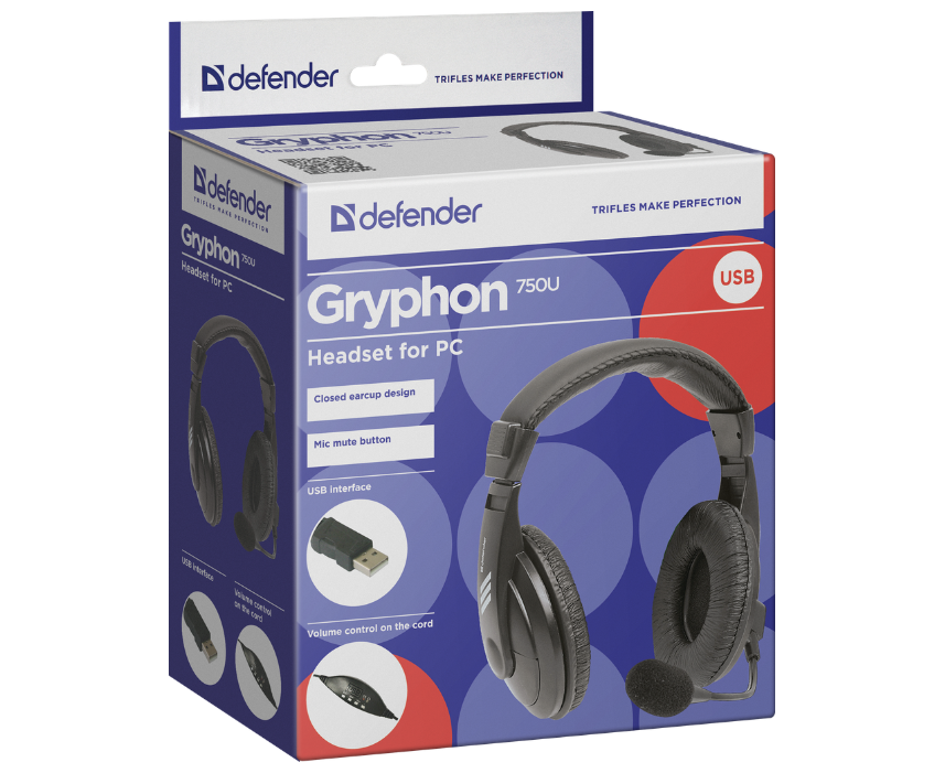 Гарнитура DEFENDER Gryphon 750U USB, черный, 1.8м кабель 63752